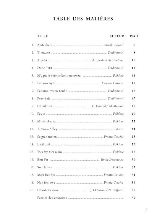 This compilation is an initiative that is part of the safeguarding of the intangible cultural heritage of Haiti. This collection is aimed at primary schools, music schools, and all young people starting out in music.